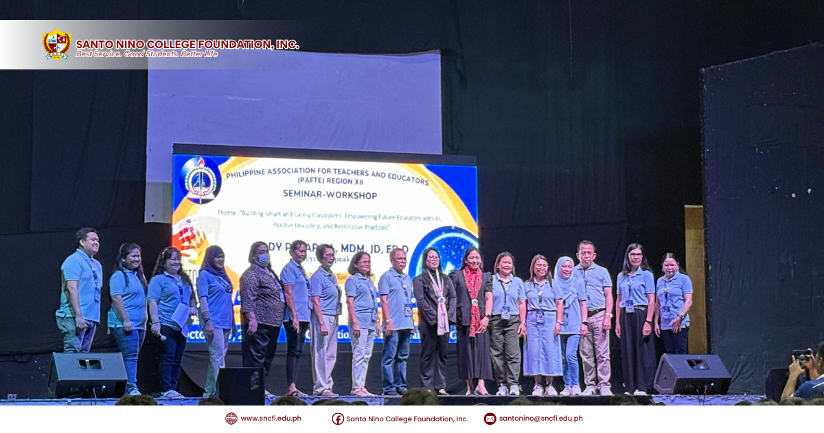 The Santo Nino College Foundation, Inc. (SNCFI) continues to advance its mission of nurturing competent and compassionate future educators through its active participation in the Philippine Association for Teachers and Educators (PAFTE) Region XII Seminar-Workshop held on October 4, 2025, at the KCC Mall Convention Center, General Santos City. Anchored on the theme โBuilding Smart and Caring Classrooms: Empowering Future Educators with AI, Positive Discipline, and Restorative Practices,โ the event focused on equipping pre-service teachers with the necessary tools and values for 21st-century teaching and learning.