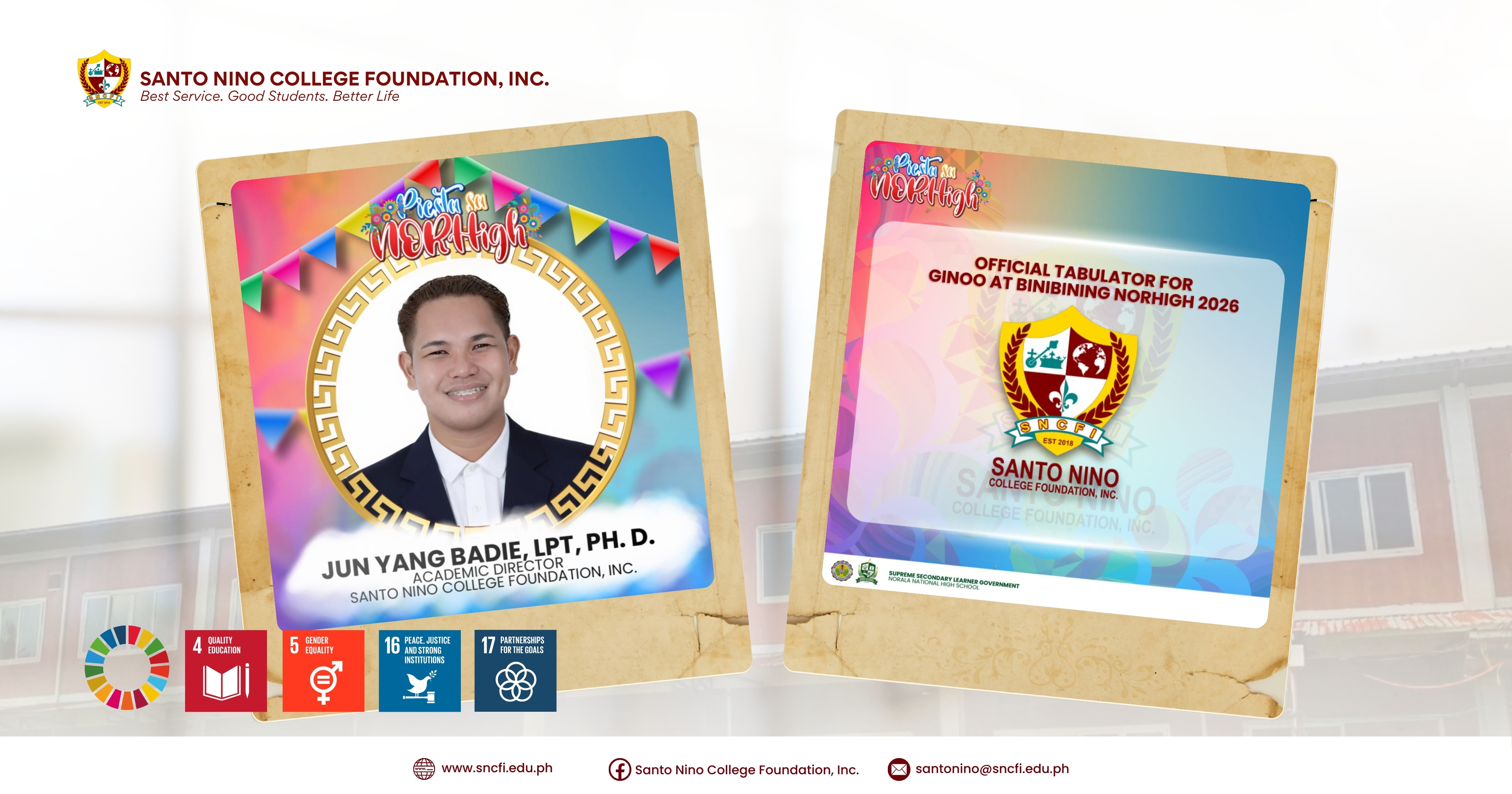 The Supreme Secondary Learner Government also extended its invitation to SNCFIโs Academic Director, Dr. Jun Y. Badie, LPT, who served as one of the distinguished members of the Board of Judges. His presence underscored the institutionโs commitment to academic excellence and community engagement. The strong partnership between Norala National High School and SNCFI embodies SDG 17: Partnerships for the Goals, demonstrating how collaboration between educational institutions fosters youth empowerment, credibility in governance, and shared development outcomes.
